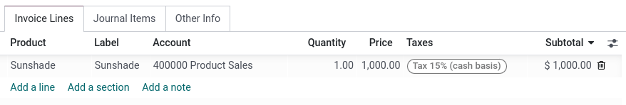 To illustrate the impact of cash basis taxes on accounting transactions, let’s take an example with the sales of a product that costs 1,000$, with a cash basis tax of 15%.